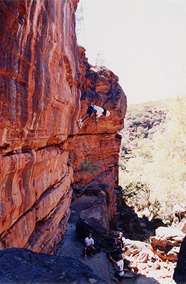 | 指定されたKalbarri Backpackersで待つと定時にガイドが迎えに来て、我々を含めたツアー客をピックアップ。 Abseilingとは岩山をロープで下りるもので、ロッククライミングの逆だと思えばいい。 場所はZ-Bendだが、昨日散策したHawk's Headとは別の渓谷で行う。料金大人一人A$20('00年当時) |