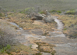 Esperanceは白い砂浜のビーチで有名だが、もう一つの名所はなんと言ってもCape Le Grand National Park内にそびえ立つFrenchman Peakだろう。昨年はUruruを登岩したのだが、今年はぜひともこのFrenchman Peakを踏破したいと密かに計画を練っていたのだ。 Frenchman Peakとは標高300mほどの岩山で、ナポレオンの肖像画などで見られる横長の帽子に似ていることから命名された。あの帽子のようになだらかな形をしていて、麓からのWalk Trailに沿って歩けば約1時間ほどで頂上まで登ることができる。 とは言ってもUruruのような登岩者のための手すりや鎖などのサポートはないので、場所によっては急勾配が続き、おまけに平野のど真ん中に位置するので吹き付ける風も強く、なかなか難儀する。この一帯は春にはワイルドフラワーが一面に咲き乱れる場所で、夏でもいくつかの種の花が見られる。 頂上付近は巨大な空洞(Frenchman Peak 'Eye')があり、この山を眺める方向によっては兜のようにも見える。晴れていれば遠くEsperanceの町まで見渡せるのだが、あいにくの天気であまり視界は良くない。しばし、休憩しただけで早々に下山する。 |