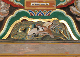 | 500以上の彫刻で埋め尽くされた「陽明門」は、一日中眺めても飽きないことから、別名「日暮門」とも言われている。 正面屋根には「鬼瓦」、扁額下には「龍と息」、上層の梁には「龍馬と目抜きの龍」、下層上部には「唐獅子」、下層の梁には「周公聴訴」や「孔子観河」など中国故事の彫刻が施されている。 |