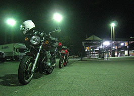 | ほどなく上田菅平ICから上信越道にのる。 東部湯の丸SAで給油休憩。 バイクの姿は皆無。 80km/h規制が出てくるので、おとなしく巡航速度で流す。 そうでなくてもこの区間は山間部でトンネルも多いので、速度を上げる気にはなれず。 横川SAで小休止。ここでもバイクの姿は皆無。 速度規制は解除されたが、カミさんのバイクを考慮し法定速度内で流す。 藤岡Jctから関越道へ入る。 上里SAで小休止。 さすがに単調な走りで睡魔にはタバコでも勝てそうに無い。 そこで、カミさんの勧めもあってベンチで横になる。 たちまち爆睡状態。ほんの数分でも、仮眠の効果は絶大。 仮眠後、すっきりしたところで出発。その後も大人しい走りが続く。 高坂SAで給油休憩。 時間はすでに22:00を回っていて、この季節でも夜の寒さが徐々に効いてくる。 SA内ではなにやらデコレーションを施したカスタムスクーターの集会を催している。 |